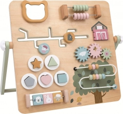 Ez a Montessori elvek alapján készült, fából készült motoros tábla tanyasi motívumokkal változatos interaktív elemeket kínál: forgó fogaskerekek, csúsztatható elemek, gyöngy- és drótlabirintus, kis abacus, valamint bedobós formák. Minden áttekinthetően elrendezett, minőségi anyagokból készült a biztonságos és tartós játék érdekében.