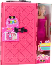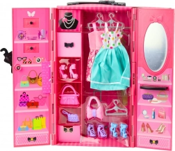 - 30 cm-es baba; rózsaszín ruhásszekrény; 2 ruha; vállfák; cipők; táskák; tükör; eredeti csomagolás