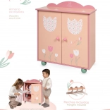 Ajándékozzon a gyerekeknek elegáns helyet a babáik ruháinak. A TULIPE kollekció fa ruhásszekrénye meleg lazac színű pasztell árnyalatokkal és finom virágmintával szépen illeszkedik bármelyik gyerekszobába. A ruhatartó rúdnak és a három masszív vállfának köszönhetően a kis stylistoknak minden kéznél van és átláthatóan elrendezhető.