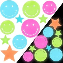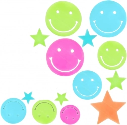 Vidám fluoreszkáló matricaszett beragyogja a gyerekszobát, és mesés hangulatot teremt. Rövid fénynek való kitettség után láthatóvá válik a finom derengés a sötétben, valamint a színes smiley-k és csillagok különböző méretekben. A öntapadó hab elemeknek köszönhetően megbízhatóan tapadnak falon, mennyezeten és bútoron, és nyom nélkül könnyen eltávolíthatók. Biztonságos, nem toxikus anyagokból készül, megfelel az európai szabványoknak.