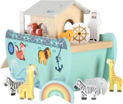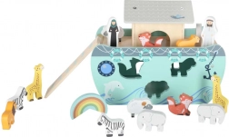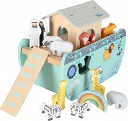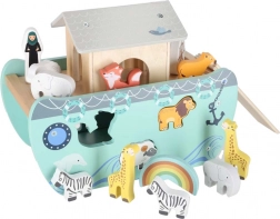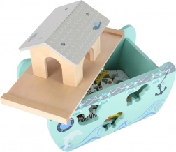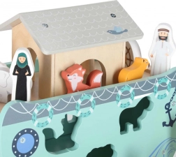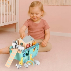 Fedezze fel a fa játékot, amely egyesíti a formaberakót, a szabad játékot és a történetmesélést. A levehető rámpával és tetővel ellátott bárka állatfigurák készletét és két szereplőt rejt – Noét és feleségét. A gyerekek megrakhatják a hajót, kormányozhatják, és a megfelelő nyílásokba illeszthetik az állatokat.