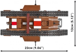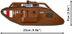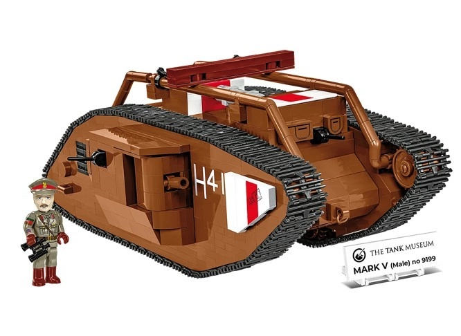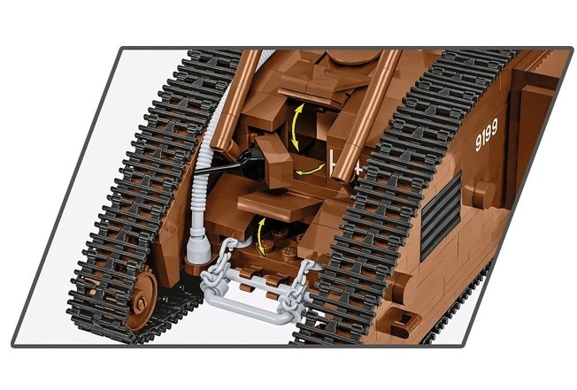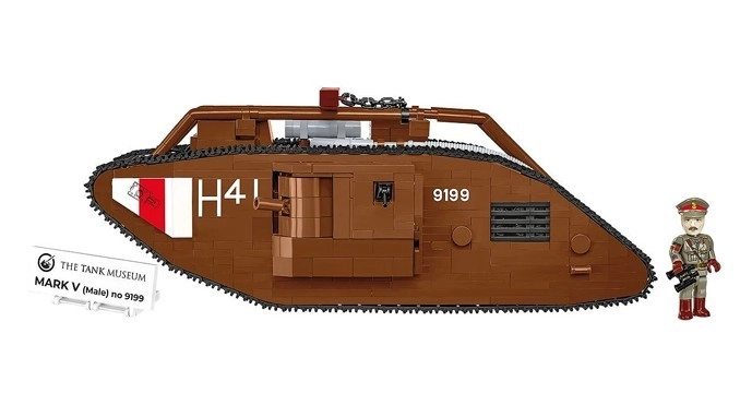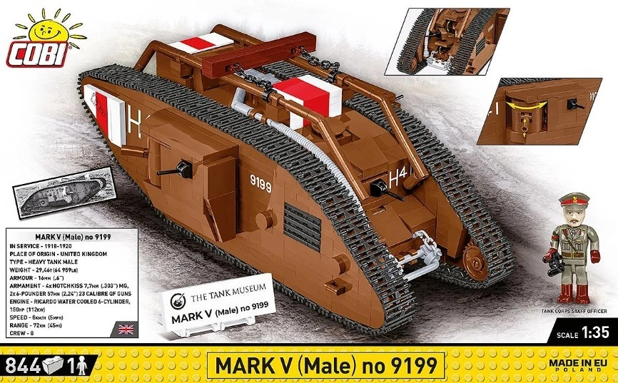 Ez a precízen kidolgozott modell a legendás brit MARK V (Male) tankot idézi meg, a bovingtoni The Tank Museum 9199-es számú, hiteles múzeumi példánya alapján. Az 1:35-ös méretarány tökéletesen illeszkedik a COBI figuráihoz és más modelljeihez. A tartós, matrica nélküli nyomatok, a funkcionális lánctalpas meghajtás és a részletgazdag kivitel különösen vonzó darabbá teszik a gyűjteményedben.