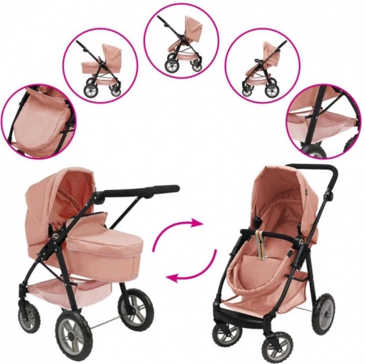 Stílusos 2 az 1-ben babakocsi rózsaszín kivitelben, luxus kidolgozással, levehető üléssel és átalakítható sport babakocsivá. A állítható tolókar, a forgó első kerék és a nagy kosár miatt ideális a kis anyukáknak. Körülbelül 53 cm-es babákhoz alkalmas.