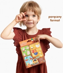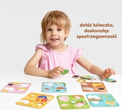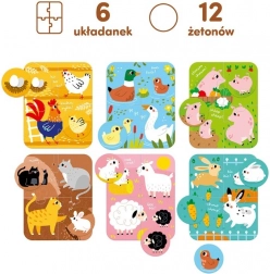 A készlet 6 aranyos, négyrészes farmjelenetet és 12 kiegészítő korongot tartalmaz – minden puzzle-hoz 2 zseton tartozik. A gyerekek először kirakják a képet, majd a megfelelő korongokat illesztik a kijelölt helyekre. A színes illusztrációk motiválnak a felfedezésre és segítik a jól ismert állatok felismerését.
