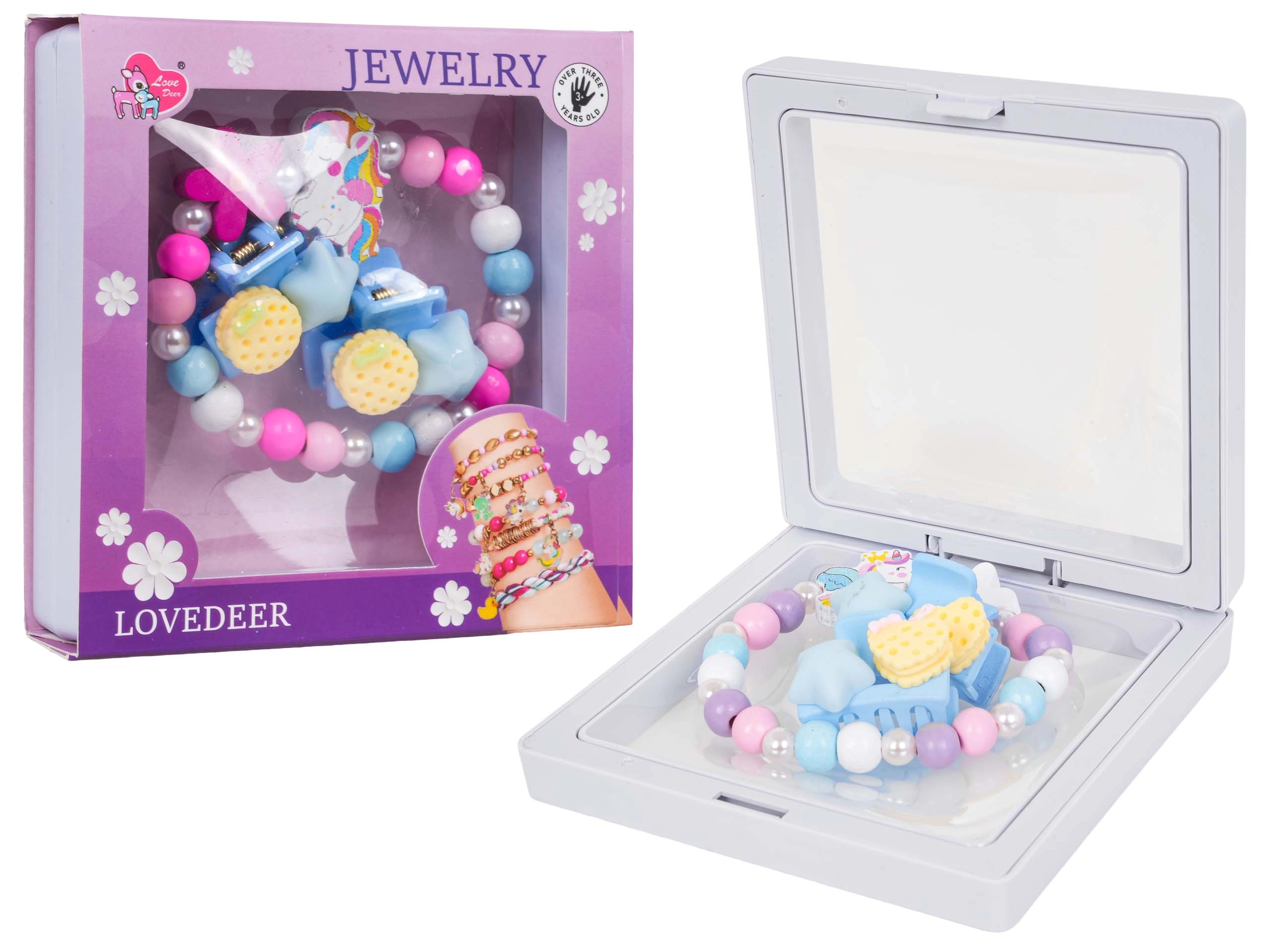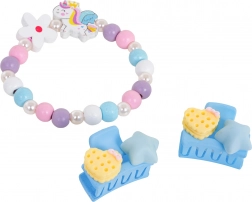 Ez a bájos gyermekszett játékos unikornis motívumot, finom színeket és kellemes anyagokat ötvöz. A karkötő színes fa gyöngyökből és gyöngyszemekből készült, amelyeket egy aranyos unikornis medál egészít ki. A két praktikus csat feldob minden frizurát, és támogatja a fantáziadús játékot.