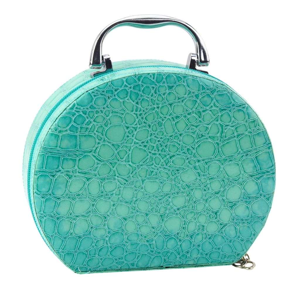 Kerek, türkiz kozmetikai táska fém fogantyúval és cipzárral, amely biztonságosan és kéznél tartja az összes kiegészítőt – otthonra és utazáshoz egyaránt ideális.