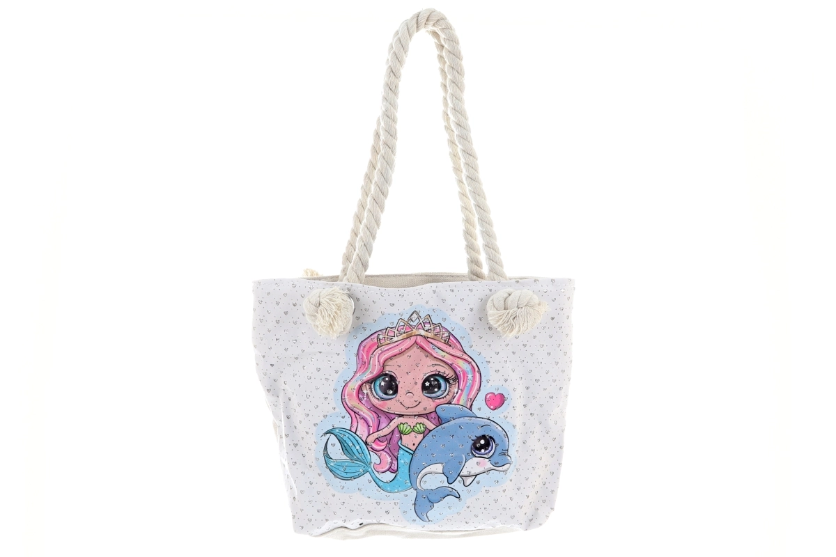 Stílusos vászon válltáska sellő motívummal, ideális a mindennapi használatra. Cipzáras fő rekesszel, mosható, gumírozott előlappal nyomattal és kompakt 28 × 20 cm-es mérettel. A kényelmes fül 2 × 23 cm biztosítja az egyszerű vállon hordást.