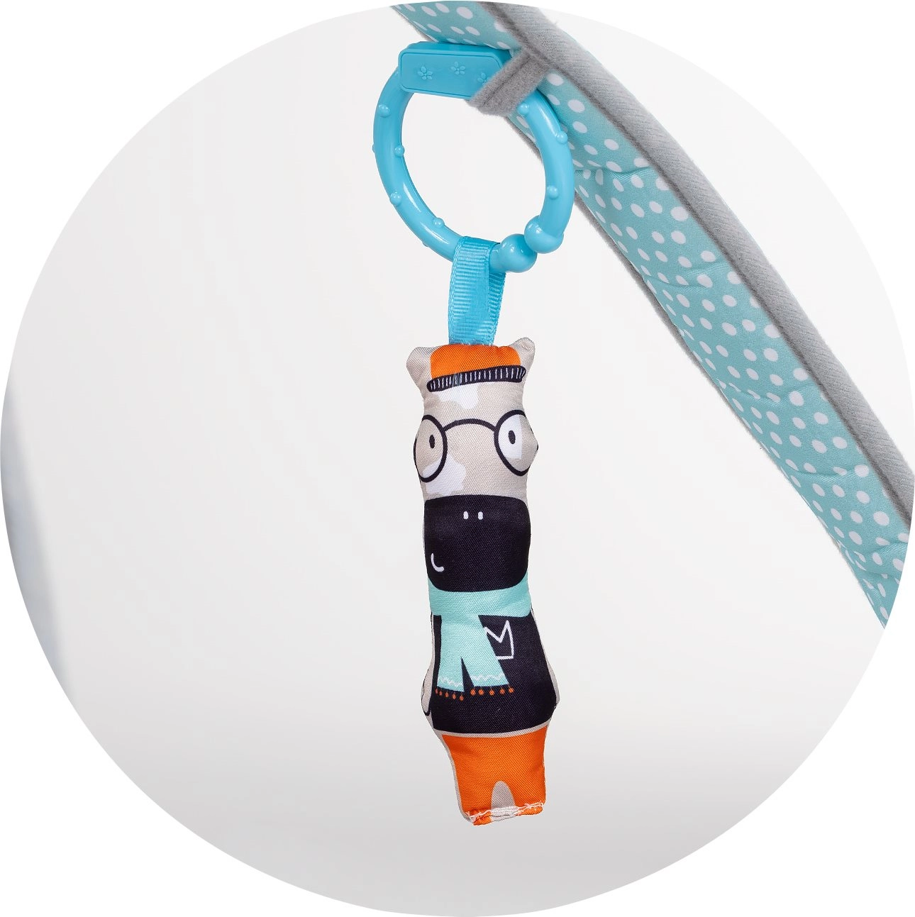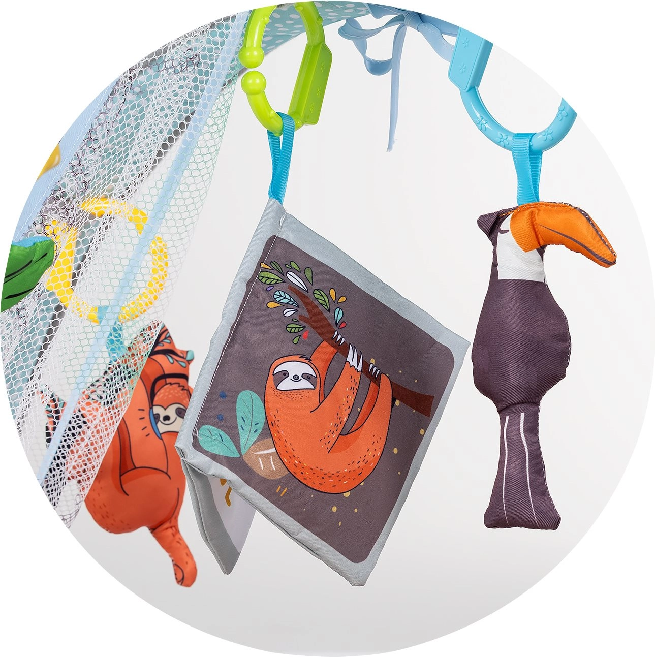 A függesztett játékok, a tükör, valamint a hang- és fényhatások fejlesztik a látást, a hallást és a kíváncsiságot, miközben mozgásra és nyújtózkodásra ösztönzik a babát.