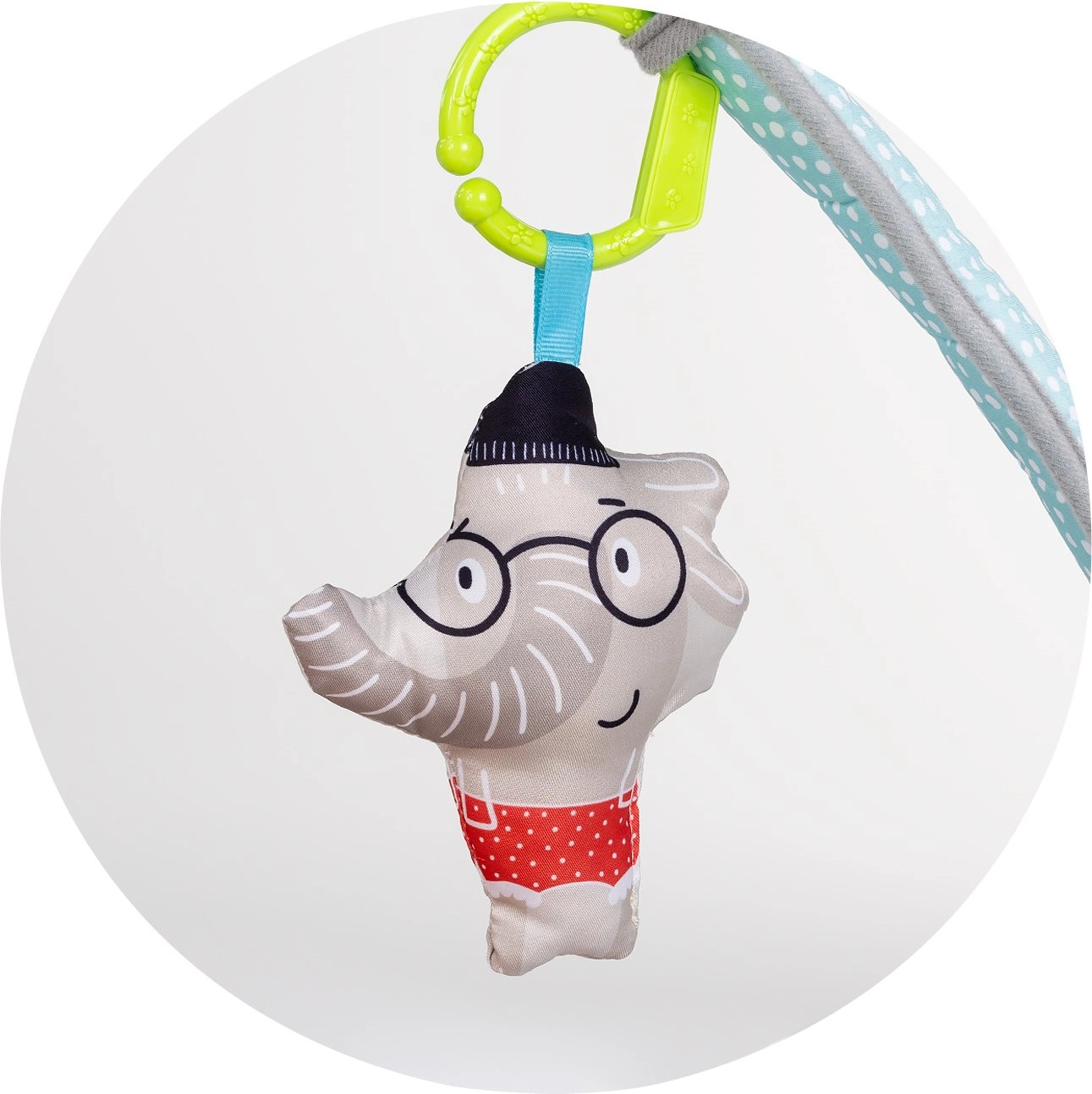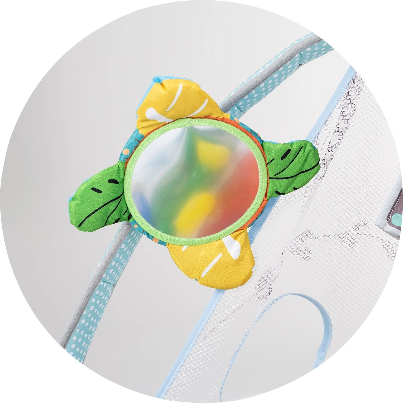 - puha alátét, levehető ívek, függesztett játékok és tükör, színes műanyag labdák