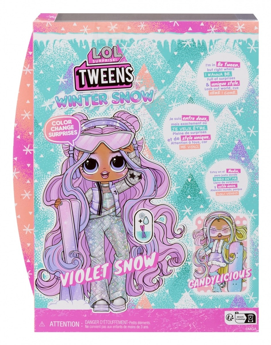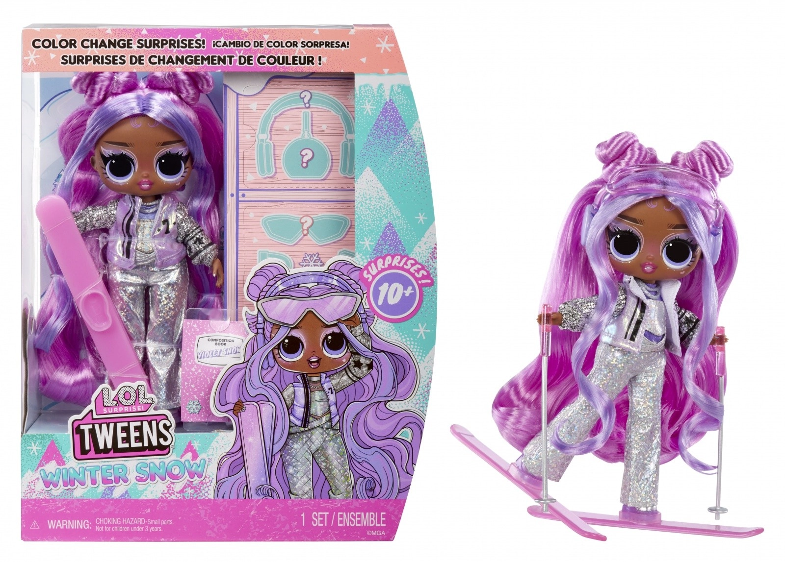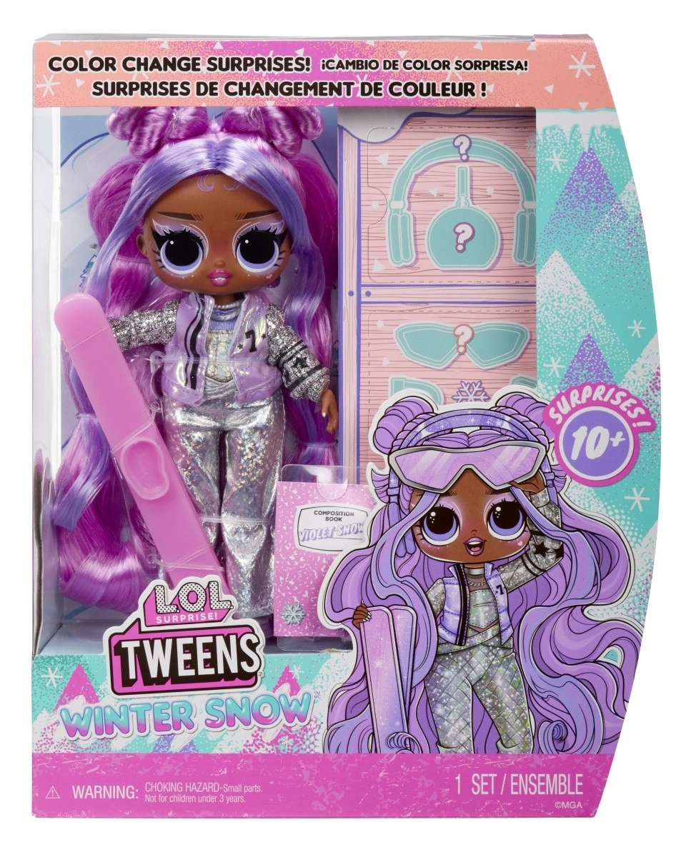 Fedezd fel a hóban a szórakozást a L.O.L. Surprise! Tweens Violet Snow babával. Mozgatható ízületekkel, fésülhető hajjal és rengeteg téli kiegészítővel érkezik a kreatív játékhoz – a szemüvegtől és a fejhallgatótól kezdve egészen a színt váltó sílécekig vagy snowboardig.