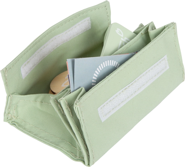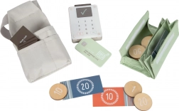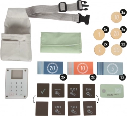Övtáska pénztárcával, játékpénzzel és kártyaolvasóval lehetővé teszi a gyerekeknek, hogy „fizetéseket” fogadjanak, nyugtát adjanak, és gyakorolják szociális készségeiket.
