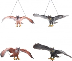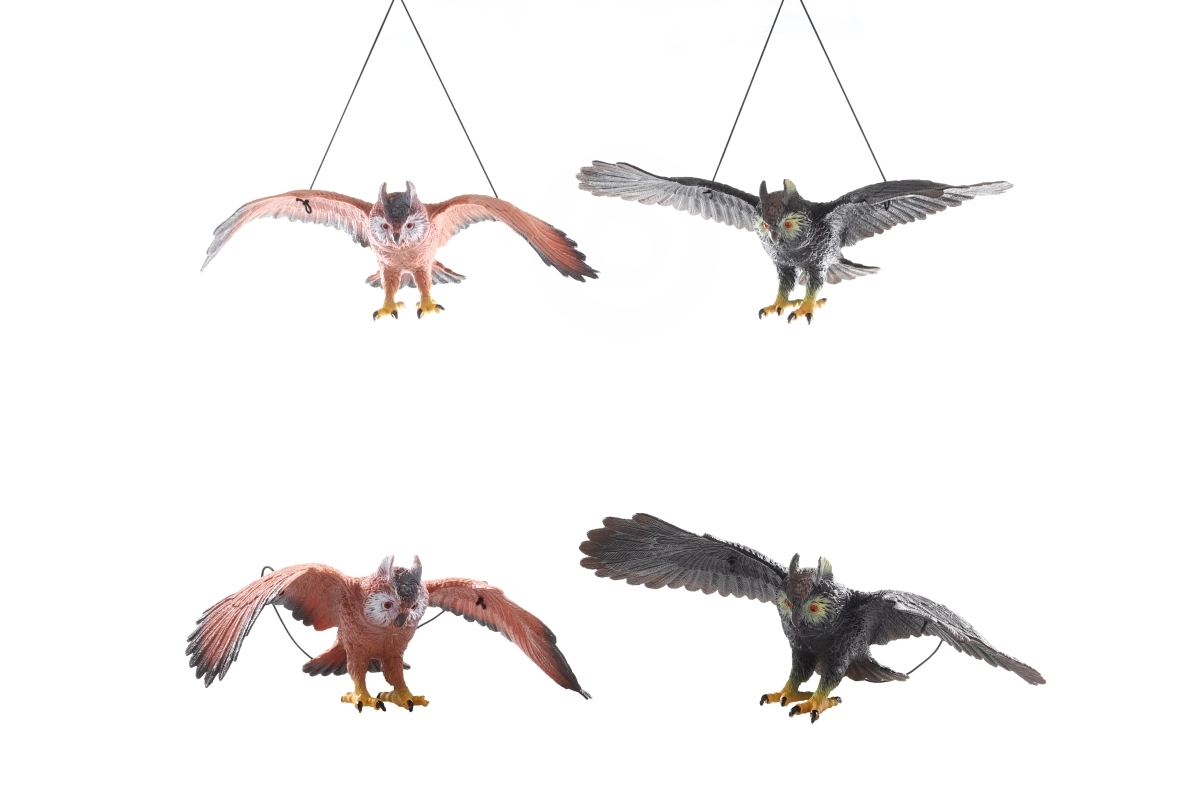 Élethű, 38 cm hosszú műanyag bagoly, könnyen felakasztható gumipántra. Részletgazdag kidolgozásának, két színváltozatának és a repülés szimulációjának köszönhetően dekoráció és játék 3 éves kortól. Beltérben és kültéren egyaránt stílusos kiegészítő, és madárriasztóként is használható.