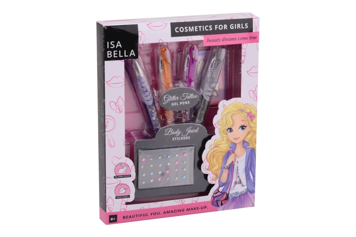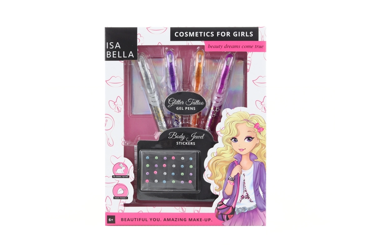 Kreatív tetoválókészlet kislányoknak, amely szórakozást és stílust kínál. Tartalmaz 4 csillogó tetoválótollat és praktikus kiegészítőket az ideiglenes tetoválások egyszerű elkészítéséhez. Ideális 6 éves kortól, fejleszti a fantáziát és a finommotorikát.