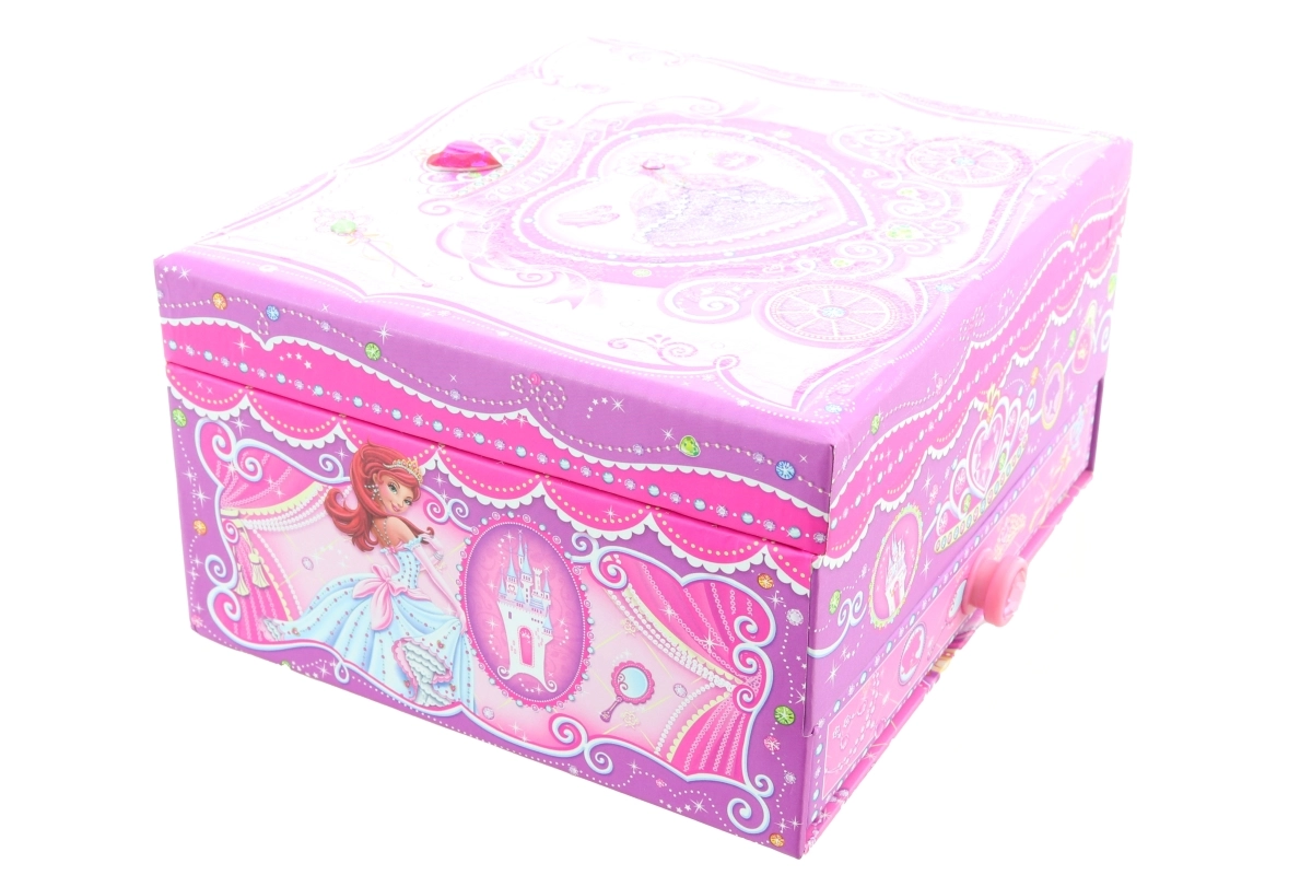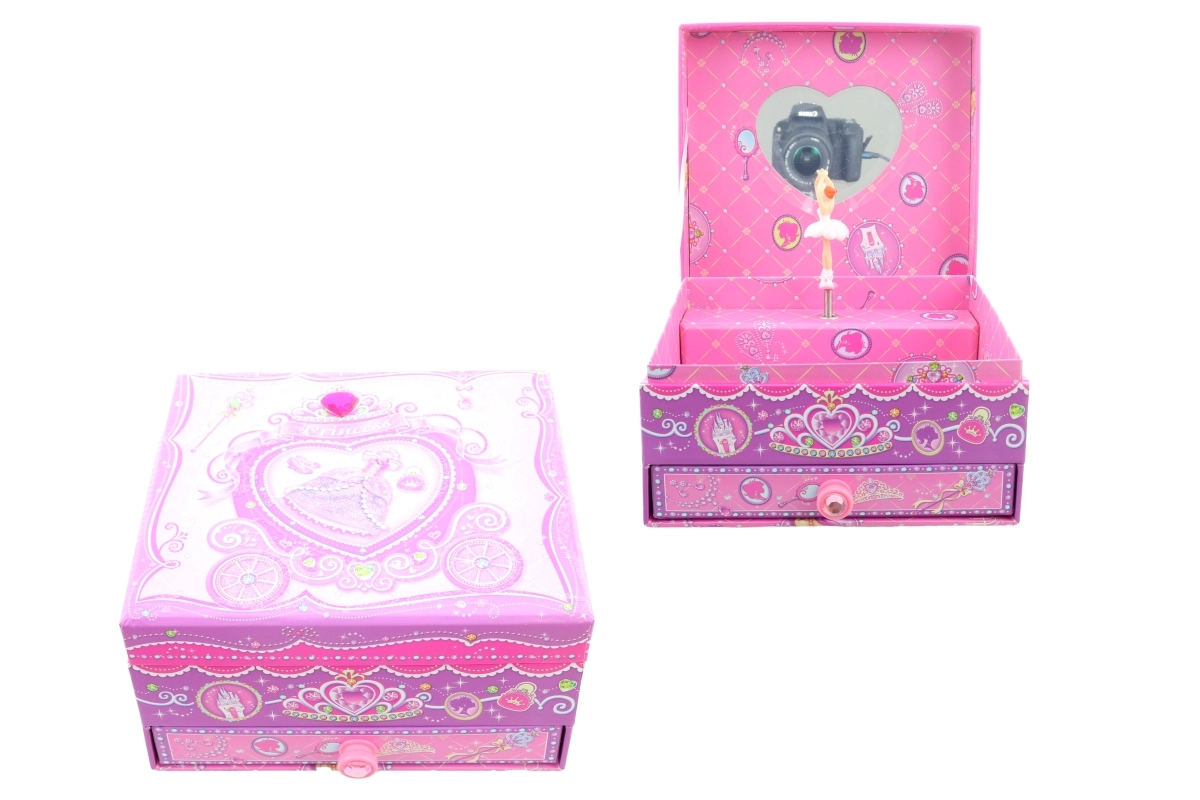 Elbűvölő zenedobozos ékszertartó hercegnős motívummal, amely minden nyitáskor örömet szerez. A kulcs felhúzása után a balerina a tükör előtt forog, és lágy dallam szólal meg, megteremtve a mesés hangulatot. Az ékszerdoboz áttekinthető rendszerezést kínál apró ékszereknek és titkos kincseknek.