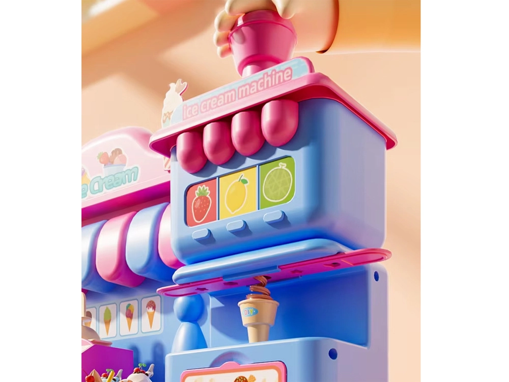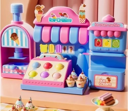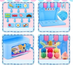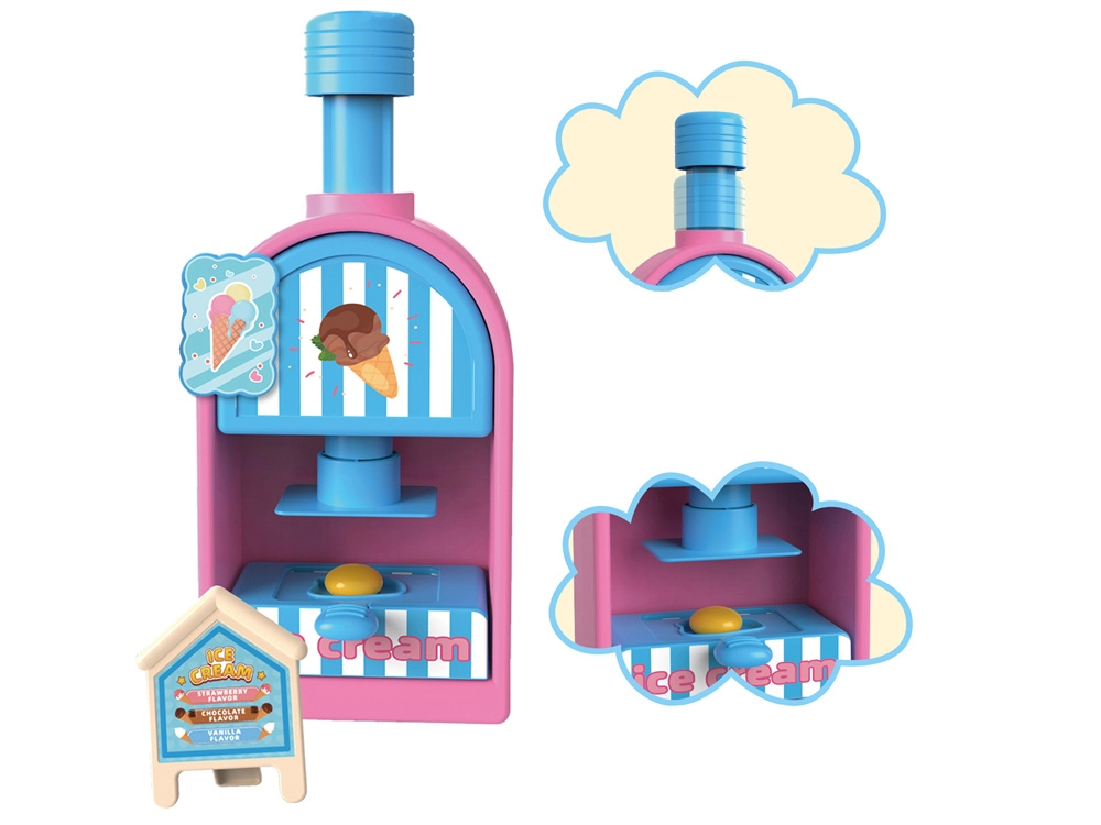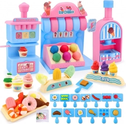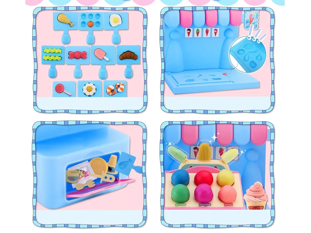 A komplex játékszett tartalmaz egy fagyigépet a színes adagok kinyomásához, egy pultot a finomságok kiállításához, valamint egy présformát „sütő” betéttel sütik és kekszek formázásához. Minden elem a rózsaszín és kék finom árnyalataiban készült, hogy az alkotások úgy nézzenek ki, mint egy valódi cukrászda vitrínjében.