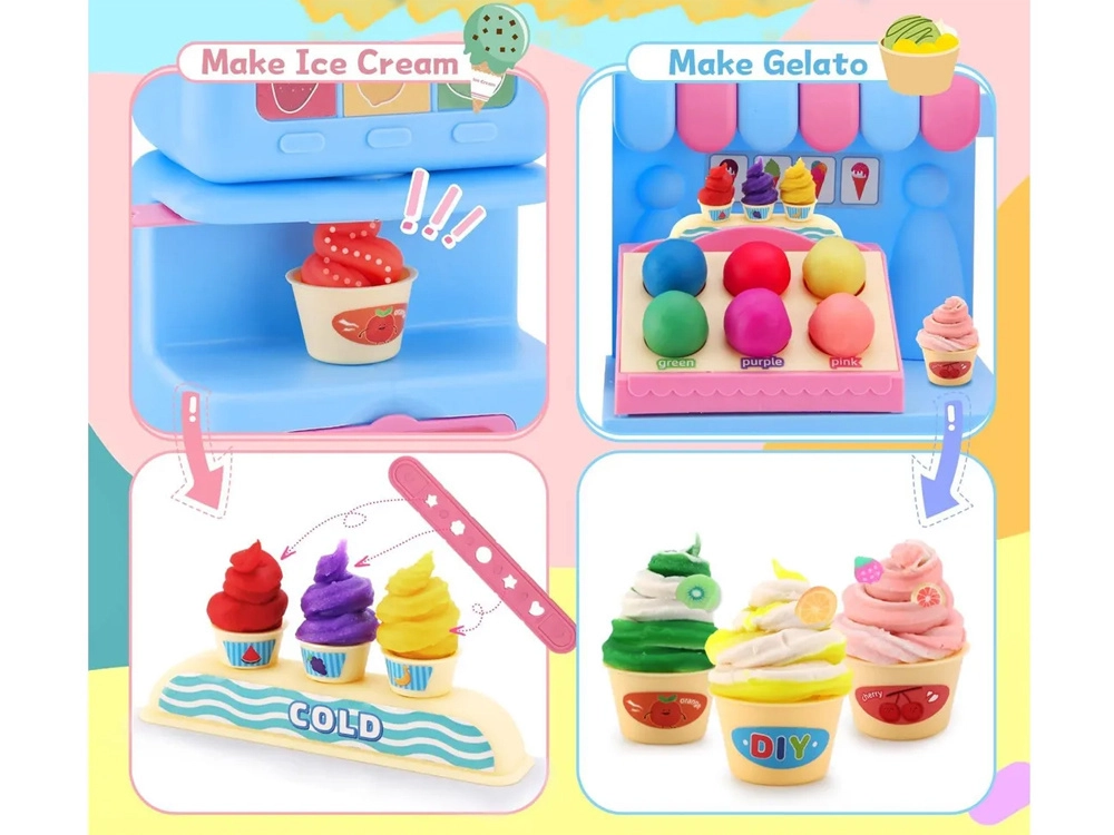 A szett gazdag felszereléssel érkezik – 12 tégely gyurma különböző színekben, formák és eszközök, továbbá poharak, tölcsérek és pálcikák jégkrémhez. A gyerekek „süthetnek” tortát, formázhatnak gyümölcsöt, készíthetnek bagettet vagy kinyomhatnak spirálfagyit.