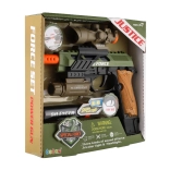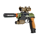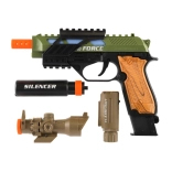 Valósághű megjelenésű műanyag pisztoly kis akciójáték-rajongóknak. Kínál fényhatásokat, hanghatásokat és praktikus kiegészítőket, mint célzó, zseblámpa és hangtompító. Elemmel működik, az elemek a csomag részét képezik.