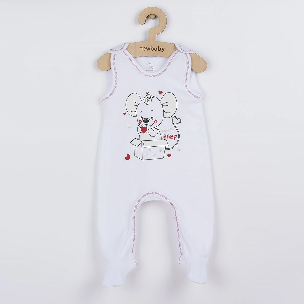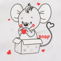 Aranyos újszülött szett New Baby Mouse fehér színben, amely kényelmet és praktikusságot kínál a mindennapi viseléshez. A szett része egy rugdalózó és kabátka 100% pamutból, amely kíméletes a baba bőréhez. A kabátka teljes hosszán, valamint a rugdalózó vállán és a lábak között található pattentos záródás megkönnyíti az öltöztetést és a pelenkázást. A rugdalózót nagy egér minta és színes szegély díszíti. Cseh márka.