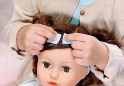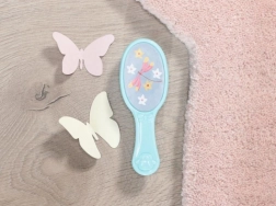 A babának barna haja van, amelyet kék kefével fésülhet, és különböző frizurákat készíthet.