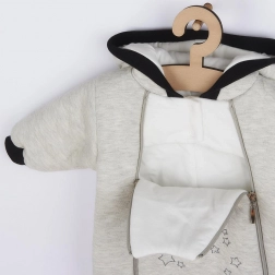 A praktikus, két oldalsó cipzáras záródás jelentősen megkönnyíti az öltöztetést és a pelenkázást, míg a teljes felületű pamut bélés növeli a viselési komfortot. A 120 g/m2 sűrűségű, poliészter szálakból készült antiallergén töltet megbízható hőszigetelést nyújt felesleges terhelés nélkül.