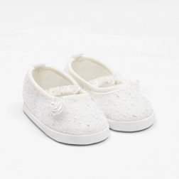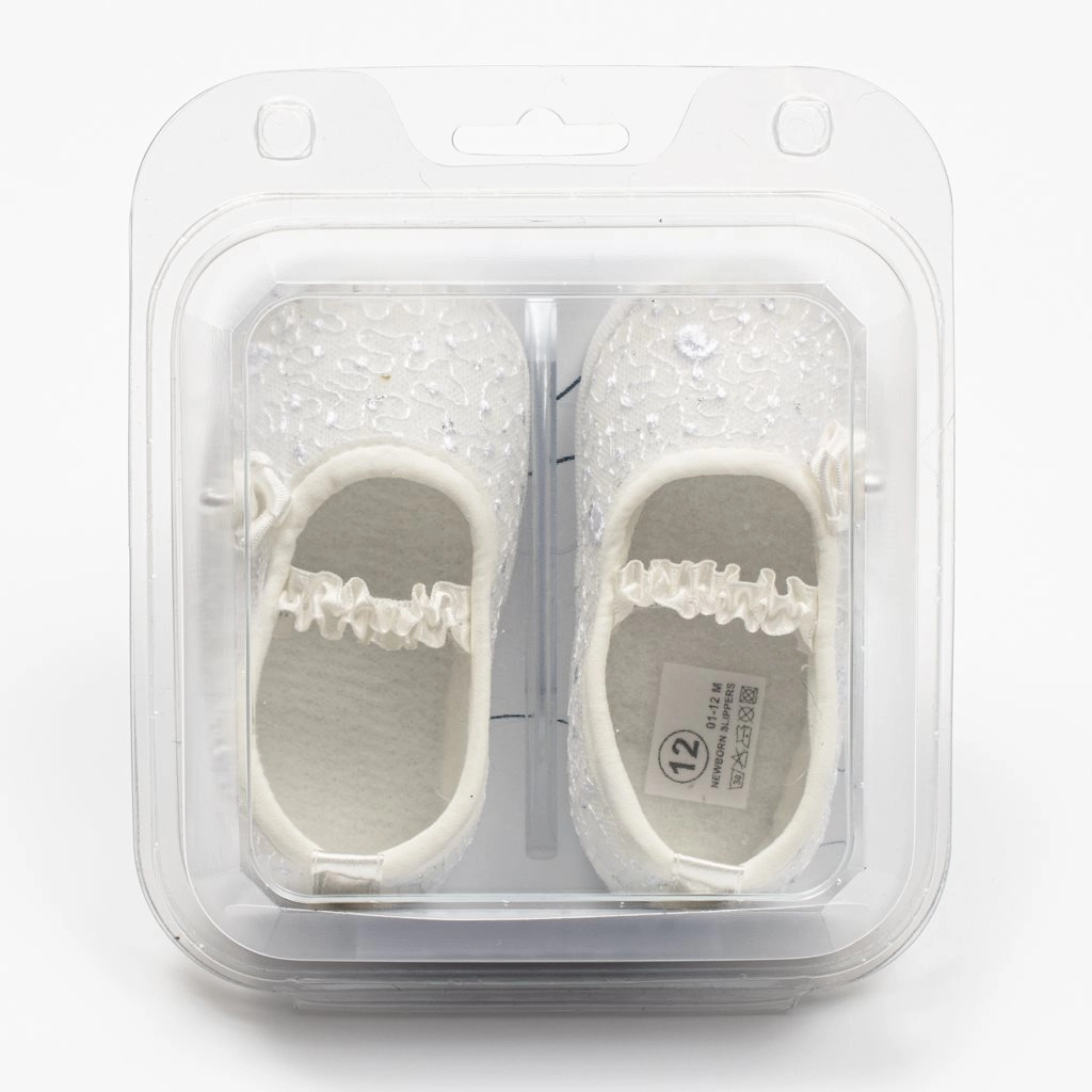 Stílusos, csipkés NEW BABY babacipők, szandálhatású, finom megjelenéssel – fotózáshoz, anyakönyvi köszöntésre, keresztelőre és más ünnepi alkalmakra kiváló. A puha anyagok és a rugalmas szegély gyengéd illeszkedést adnak nyomás nélkül, miközben a kellően tág belső tér támogatja a lábujjak és izmok természetes fejlődését.