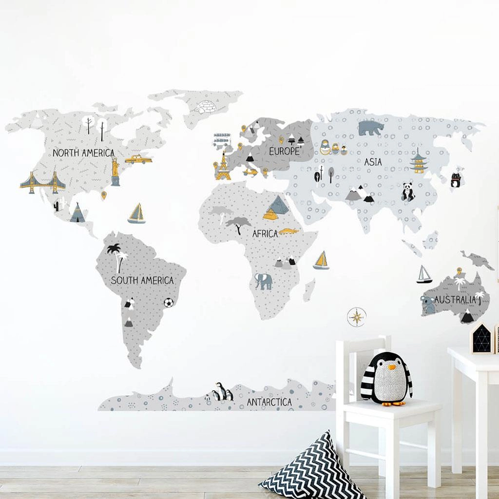 Ez a szürke árnyalatú, letisztult világtérkép barátságosabbá tesz minden gyerekszobát, miközben támogatja a játékos tanulást. A gyerekek természetesen sajátítják el a kontinensek, óceánok és égtájak neveit, és felfedeznek nevezetességeket és érdekességeket a Föld különböző pontjairól. A külön vágott elemeknek köszönhetően könnyen a falon rendelkezésre álló helyhez igazítható a kontinensek közötti távolság.