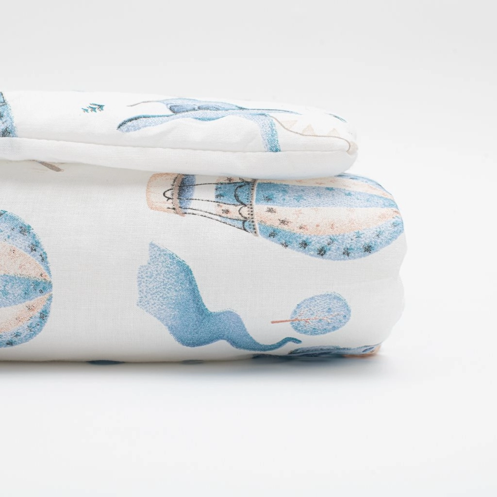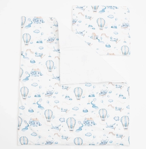 Stílusos és kényelmes New Baby Romance babakocsi szett, amely örömet szerez minden anyukának és babának. Párnát és paplant tartalmaz, mesés, felhők közti kalandot ábrázoló mintával. Kiváló minőségű, 100% pamutból készült, töltete antiallergén szál, amely biztonságos az érzékeny bőr számára. A puha, meleg és légáteresztő anyag nyugodt alvást biztosít útközben.