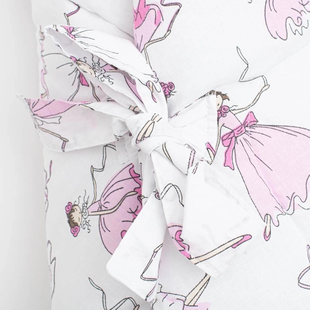 A balerina motívum gyengéd és megnyugtató hatású. A zsinóros megkötésnek köszönhetően a pólya könnyen a baba méretéhez igazítható. A hipoallergén töltet tiszta és egészséges környezetet biztosít, mikroorganizmusok és penész nélkül.