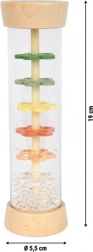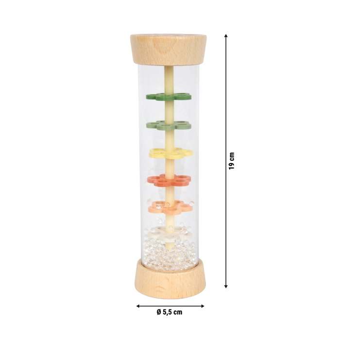 A Kis barátok esőbot elhozza a hulló esőcseppek varázsát közvetlenül a gyerekek kezébe. A csillogó gyöngyök lassan peregnek a színes virágmintás lemezek között az átlátszó csőben, és egyenletes, relaxáló hangzást hoznak létre. Ideális megnyugtatáshoz, első ritmuskísérletekhez, illetve színes csörgőként.
