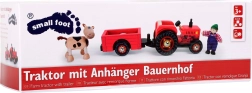 Ez a minőségi fa traktor pótkocsival minden kis gazdaságrajongónak örömet szerez. A farmer és a tehén készen állnak a munkára a földeken, és a mozgatható karoknak és lábaknak köszönhetően a történet legapróbb részletei is életre kelnek. A gumírozott kerekek bármilyen felületen sima, halk mozgást biztosítanak, így a játék beltéren sem zavaró.