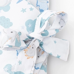 A praktikus tépőzáras zárást masnira köthető szalag egészíti ki a még biztosabb rögzítéshez. Az anyagok formaldehidmentesek, színtartók és nem tartalmaznak apró alkatrészeket, így nem irritálják a bőrt és nincs kockázata veszélyes elemek leválásának. Az OEKO-TEX STANDARD 100 tanúsítvány újszülöttek számára is biztonságot garantál.