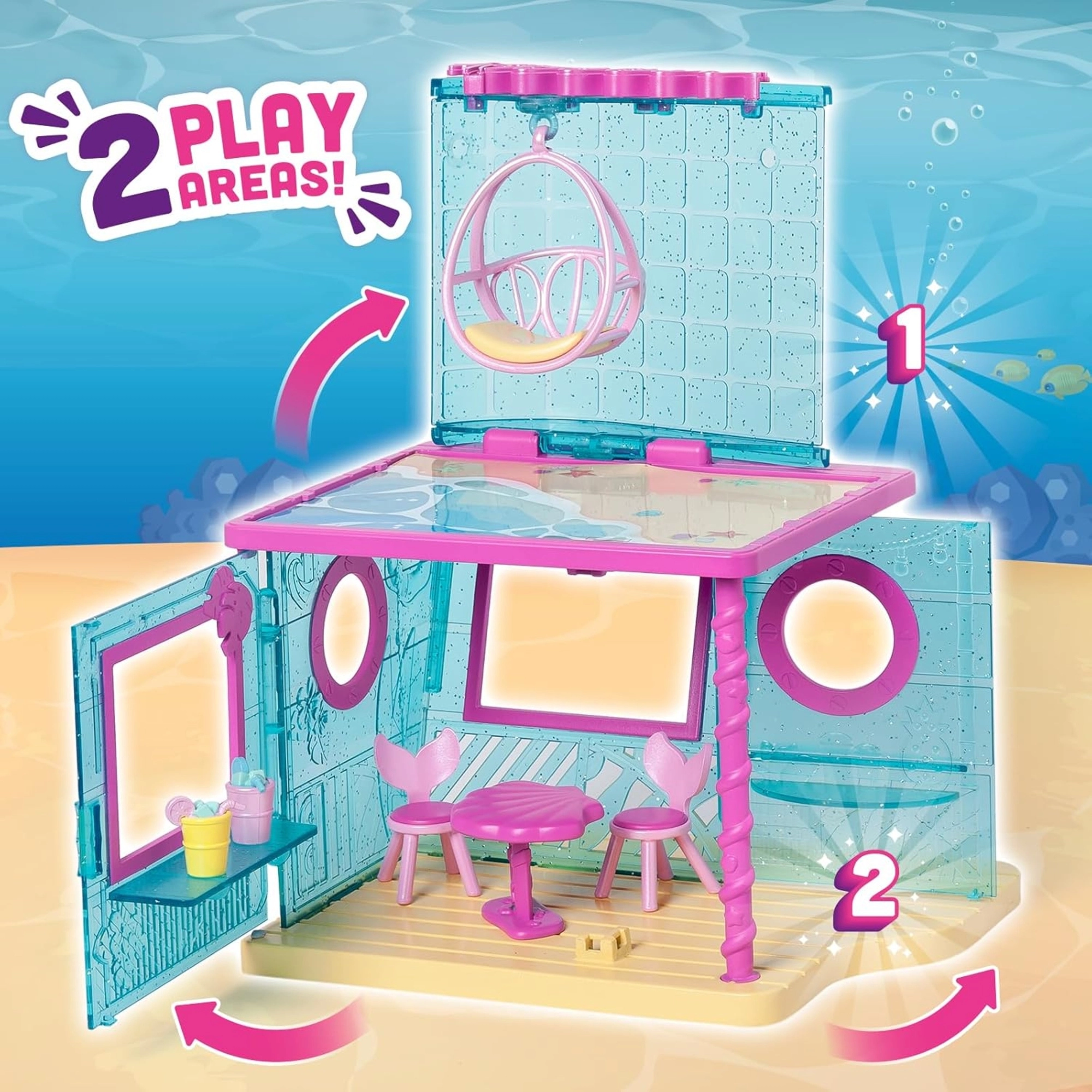 Merülj el a víz alatti világban a KookyLoos MERMAID sorozattal – a bájos Shelly sellővel, aki mozgatható ízületekkel, 3 arckifejezéssel és látványos, csillogó farokkal érkezik. Nyisd ki a sellők tengerparti házikóját, díszítsd fel kedved szerint, és élj át végtelen kalandokat hűséges társával, a kis delfinnel!