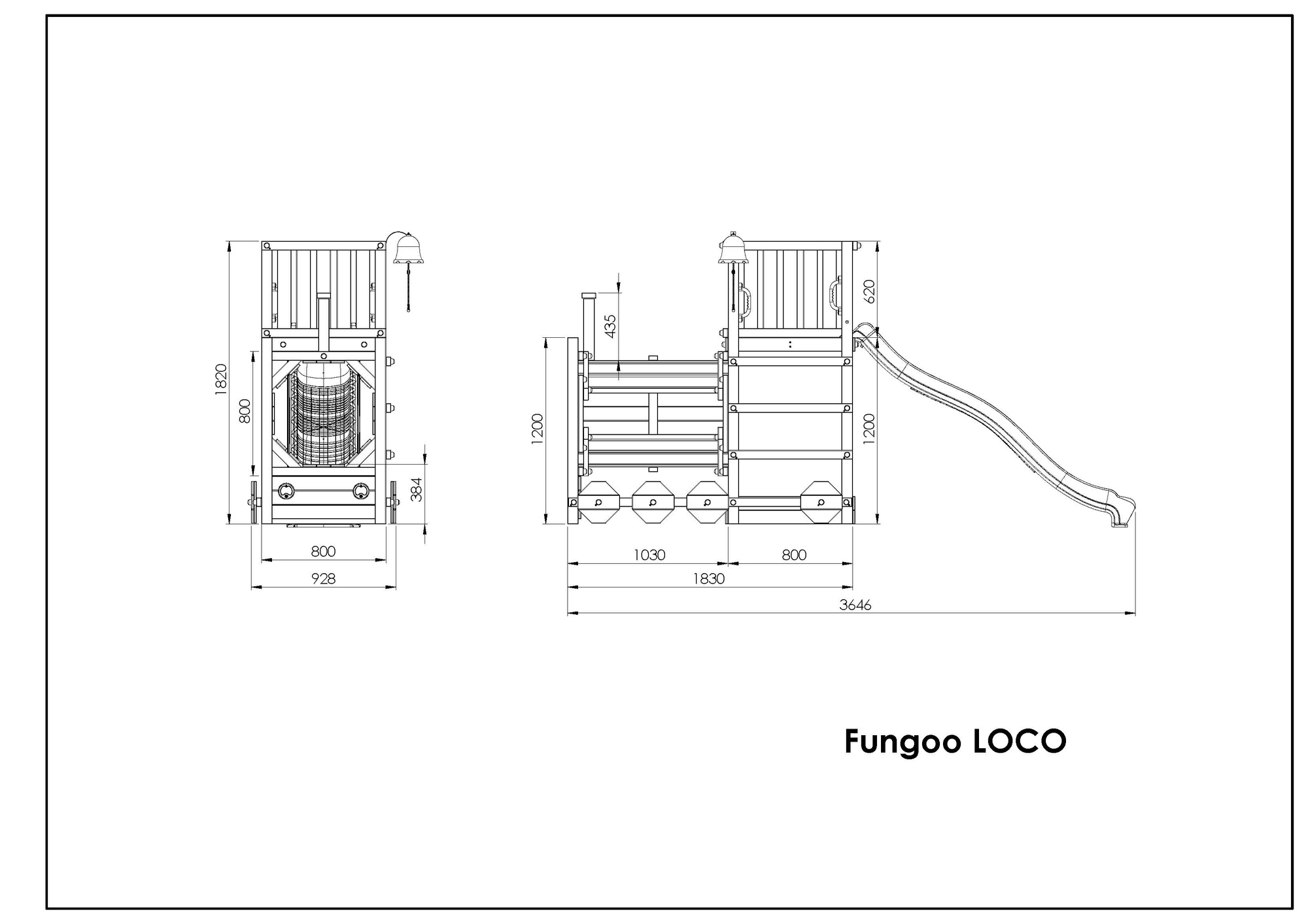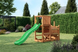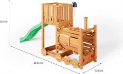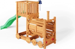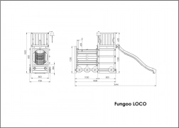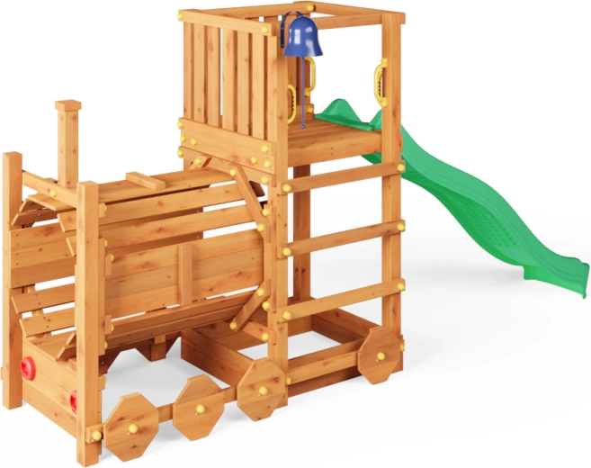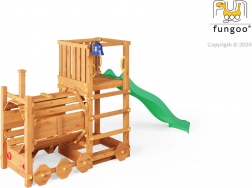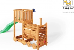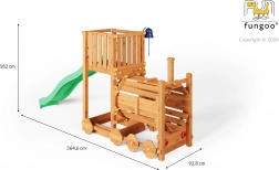 A FUNGOO Loco játszótér mozdony alagúttal kialakítással készült, amely ösztönzi az átbújós játékot, a bújócskát és a mozdonyvezetős szerepjátékot. A hosszú, 2,2 m-es hullámos csúszda rengeteg vidám lecsúszást biztosít, míg a csengő fejleszti a gyerekek képzeletét és az interaktív játékot. A minőségi, impregnált fa szerkezet időjárásálló, és biztonságosan rögzíthető a talajhoz.