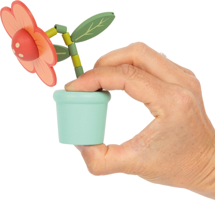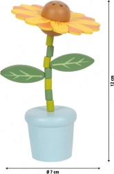 Aranyos fa táncoló virág a virágcserépben, amely örömet szerez gyerekeknek és felnőtteknek egyaránt. Az alsó rész megnyomására a virág finoman mozog – a szárak hullámoznak, a virág bólogat. Ez az egyszerű, mégis lenyűgöző játék fejleszti a finommotorikát, a koordinációt és a mozgásészlelést. A masszív fa, a sima felület és a kompakt méret miatt remekül illik a kis kezekbe. Az ár 1 db-ra vonatkozik, 5 színváltozat elérhető, véletlenszerűen küldjük.