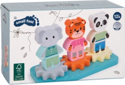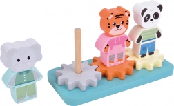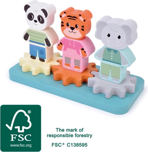 Három aranyos figura – elefánt, tigris és panda – színes, egymásra rakható elemekből áll, amelyeket a gyerekek válogathatnak, kombinálhatnak és egymásra építhetnek. Az okos fogaskerék-rendszer összeköti az összes figurát: ha az egyiket elforgatják, mind megindul, így a gyerekek azonnal látják az ok–okozatot.