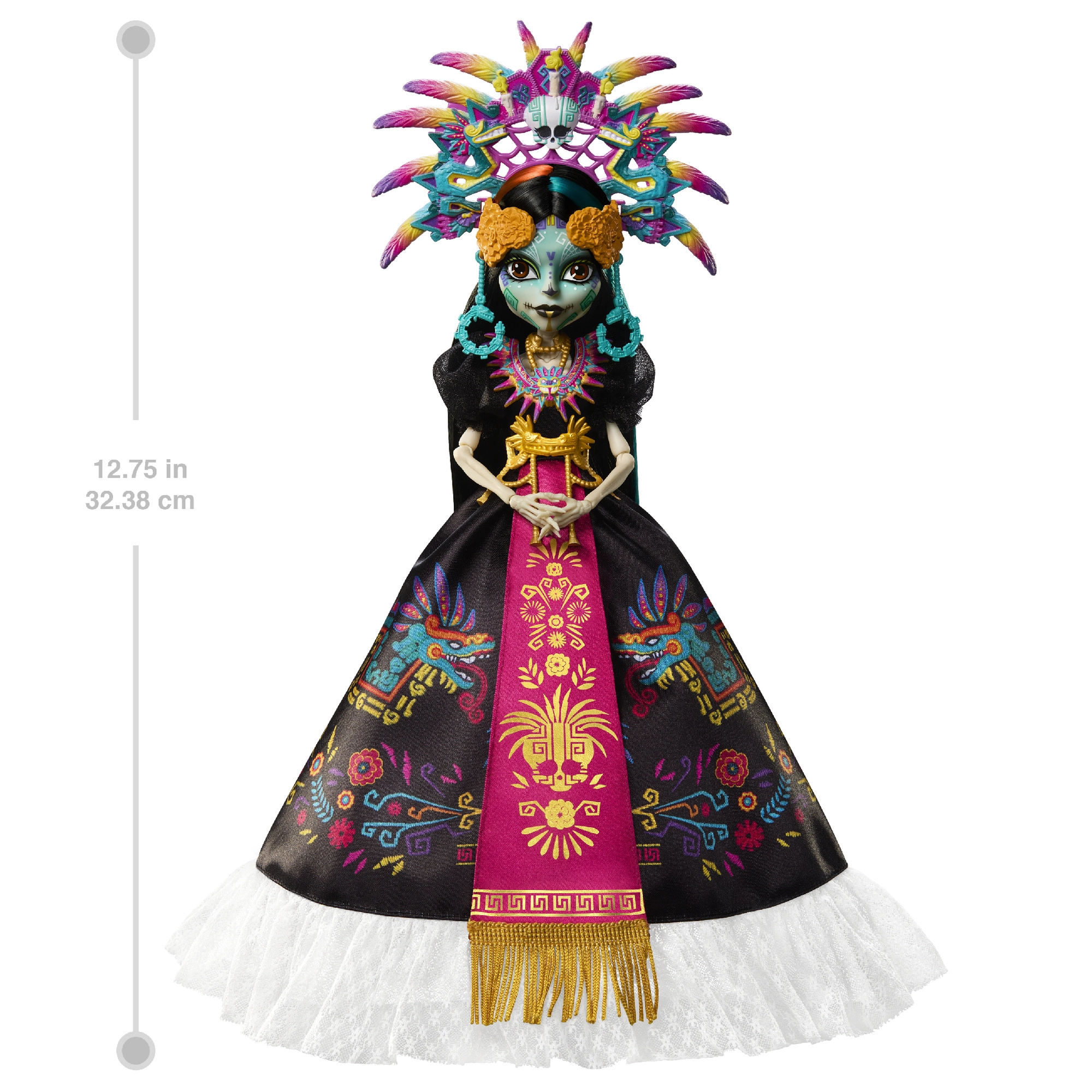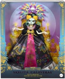 A Monster High Skullector kollekciós kiadás tiszteleg a mexikói Día de Muertos ünnep előtt. Skelita Calaveras elbűvölő, hosszú fekete, szaténfényű ruhát visel színes mintákkal és feltűnő magenta vállszalaggal arany rojtokkal. A domináns tollas fejdísz, a karakteres ékszerek és a részletes arcfestés különleges darabbá teszik a dizájn és kultúra rajongói számára.