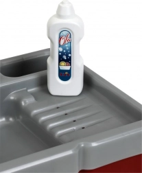 Elég megtölteni a tartályt és elfordítani a szabályzót – a víz úgy folyik, mint egy igazi mosogatónál. A gyerekek biztonságosan kipróbálhatják a tányérok és evőeszközök mosását.