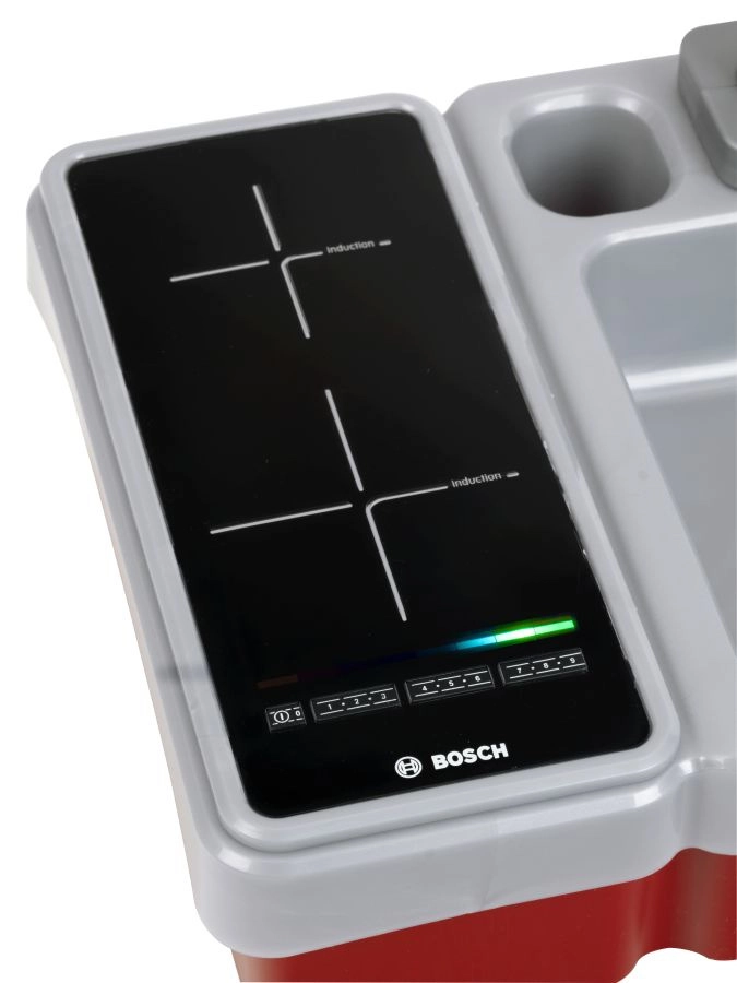 Az érintéses főzőlap aktiválás után világít és jellegzetes főzési hangokat ad ki, ezzel fokozva a szakácsos szerepjáték hitelességét.