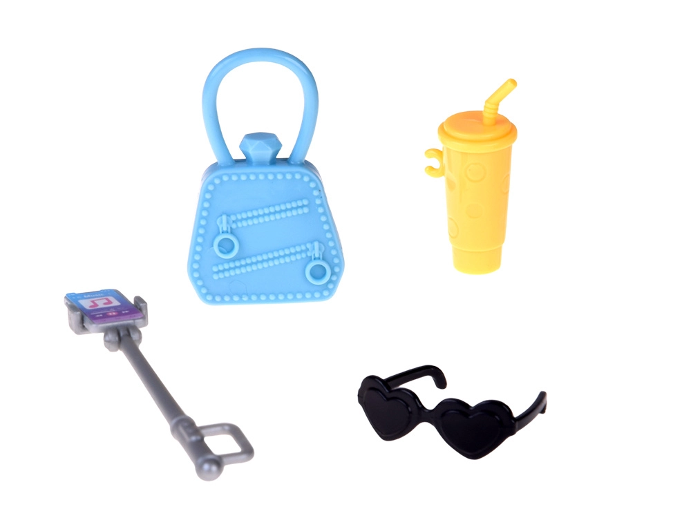 A kézitáska, a szívecske alakú szemüveg, az italospohár és a selfie bot okostelefonnal (makettek) bővítik a játék lehetőségeit.
