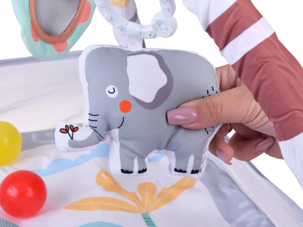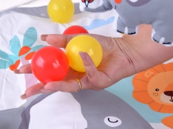 A plüss állatkák, a napocska felhővel, a babatükör és a színes labdák fejlesztik a látást, tapintást és hallást, valamint ösztönzik a nyújtózkodást, megfogást és a forgást.