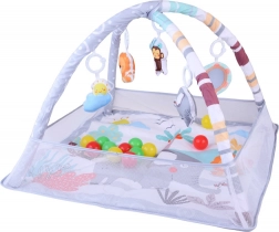 Ez az oktató szőnyeg puha párnázással és vidám állatkákkal biztonságos sarkot teremt a világ felfedezéséhez már az első napoktól. Két keresztezett, könnyen levehető ív hordozza a függeszthető játékokat, melyek nézegetésre, megfogásra és mozgásra csábítanak. A hálós oldalfalak bent tartják a játékokat és labdákat, és növelik a biztonságérzetet.