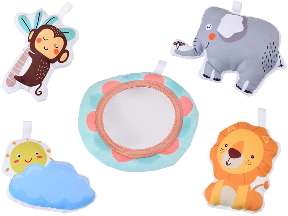 - függeszthető játékok tükörrel, napocskával és felhővel, valamint állatkákkal (oroszlán, elefánt, majmocska)