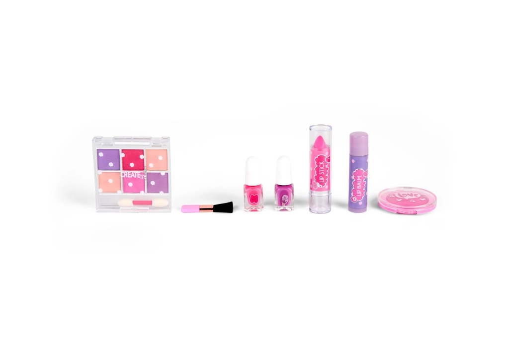 2× körömlakk, hajkréta, nagy ecset, ajakbalzsam, rúzs, kis kétoldalas applikátor, 6 csillogó szemhéjpúder paletta