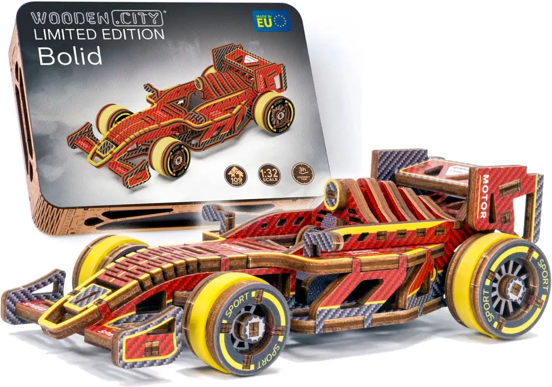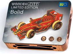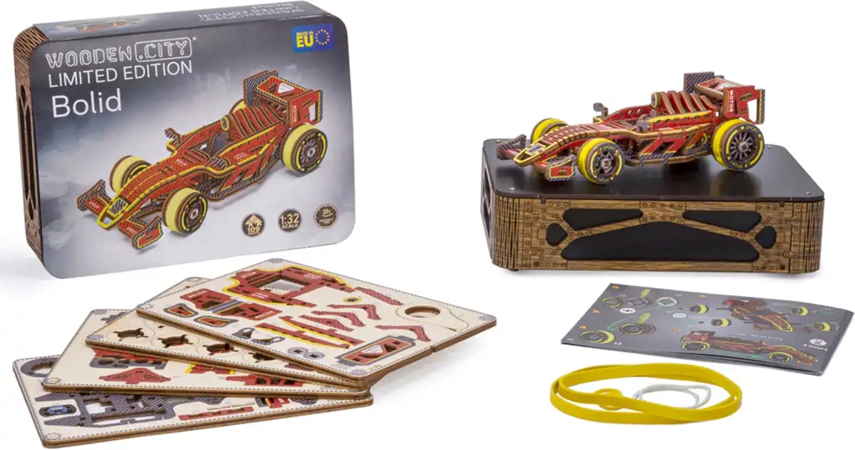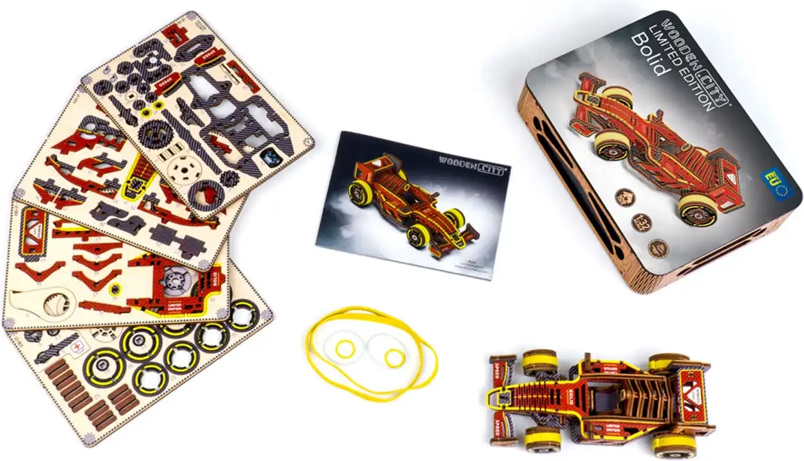 Fedezze fel a mechanikus fa modellek világát a limitált WOODEN CITY versenyboliddal. A minőségi nyír rétegelt lemezből precíz lézervágással készült elemek tökéletesen a helyükre illenek, az eredmény pedig egy sima járású, működő modell. A gumimeghajtás felhúzás után akár 1 métert is megtesz, míg a kormányozható első tengely valósághű irányítást ad a menetnek.