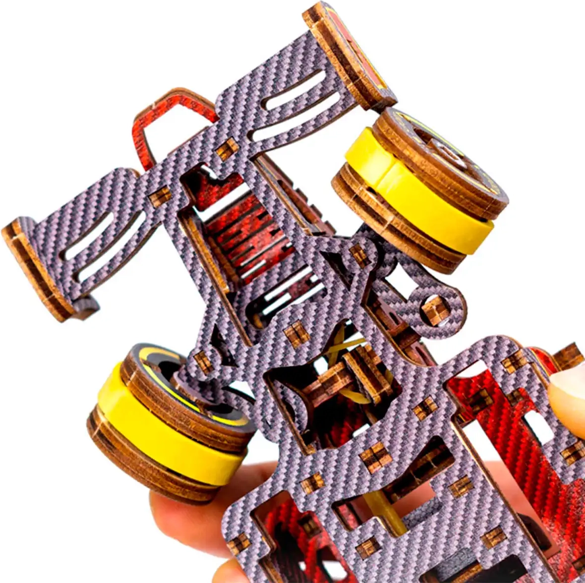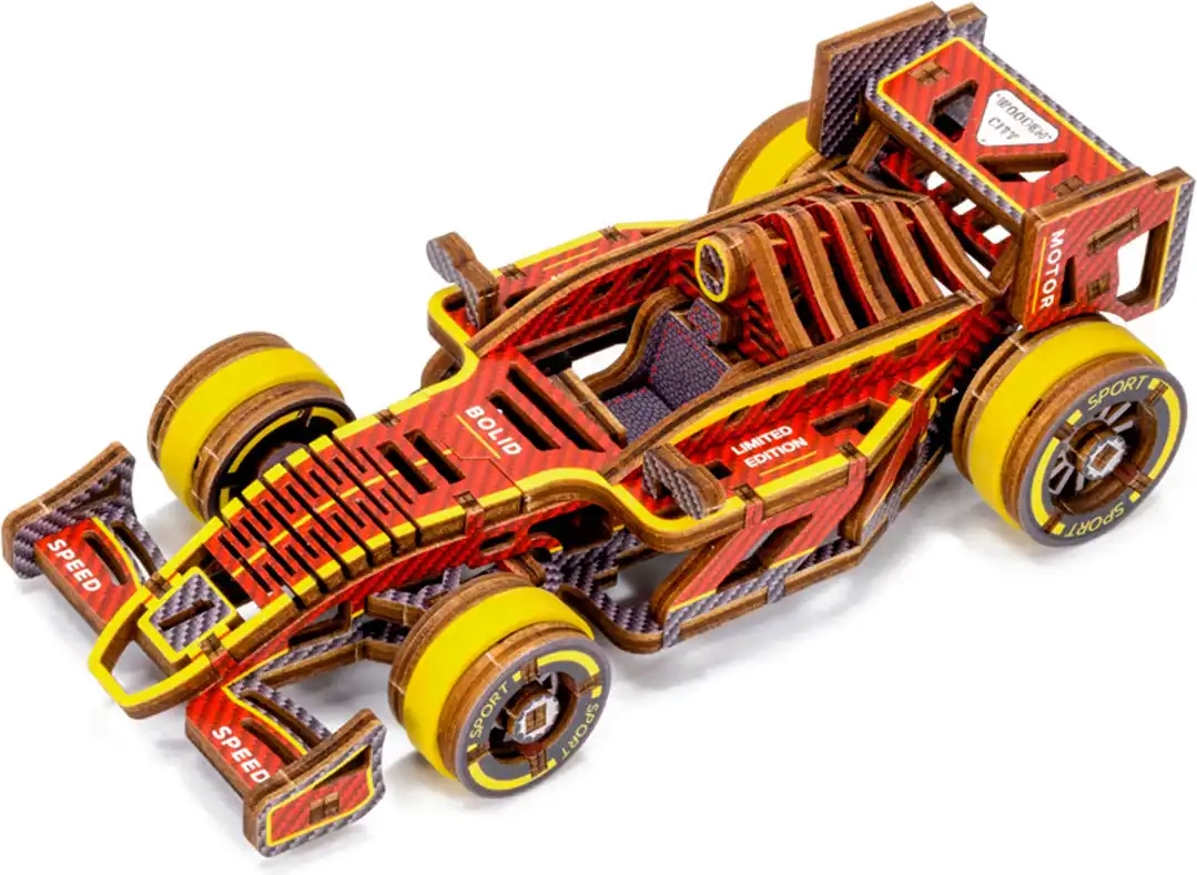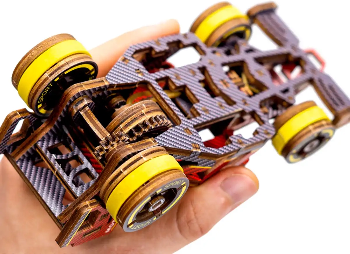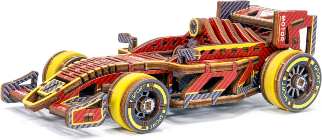Építsen stílusos formaautó-modellt természetes rétegelt lemezből, és állítsa ki az elegáns fa állványon. Ez a mechanikus modell gumimeghajtással, kormányozható első kerekekkel és ragasztó nélküli összeszereléssel órákig tartó szórakozást és dekoratív értéket kínál. A csomag része egy mágneses fa doboz, amely talpként is használható.