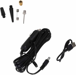 elektromos pumpa/mini kompresszor, tömlő, 5× cserélhető fúvóka, USB-kábel, autós szivargyújtó kábel, használati útmutató