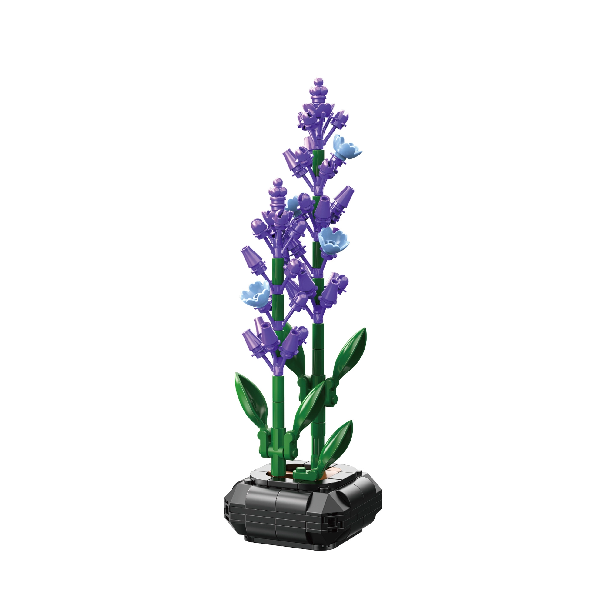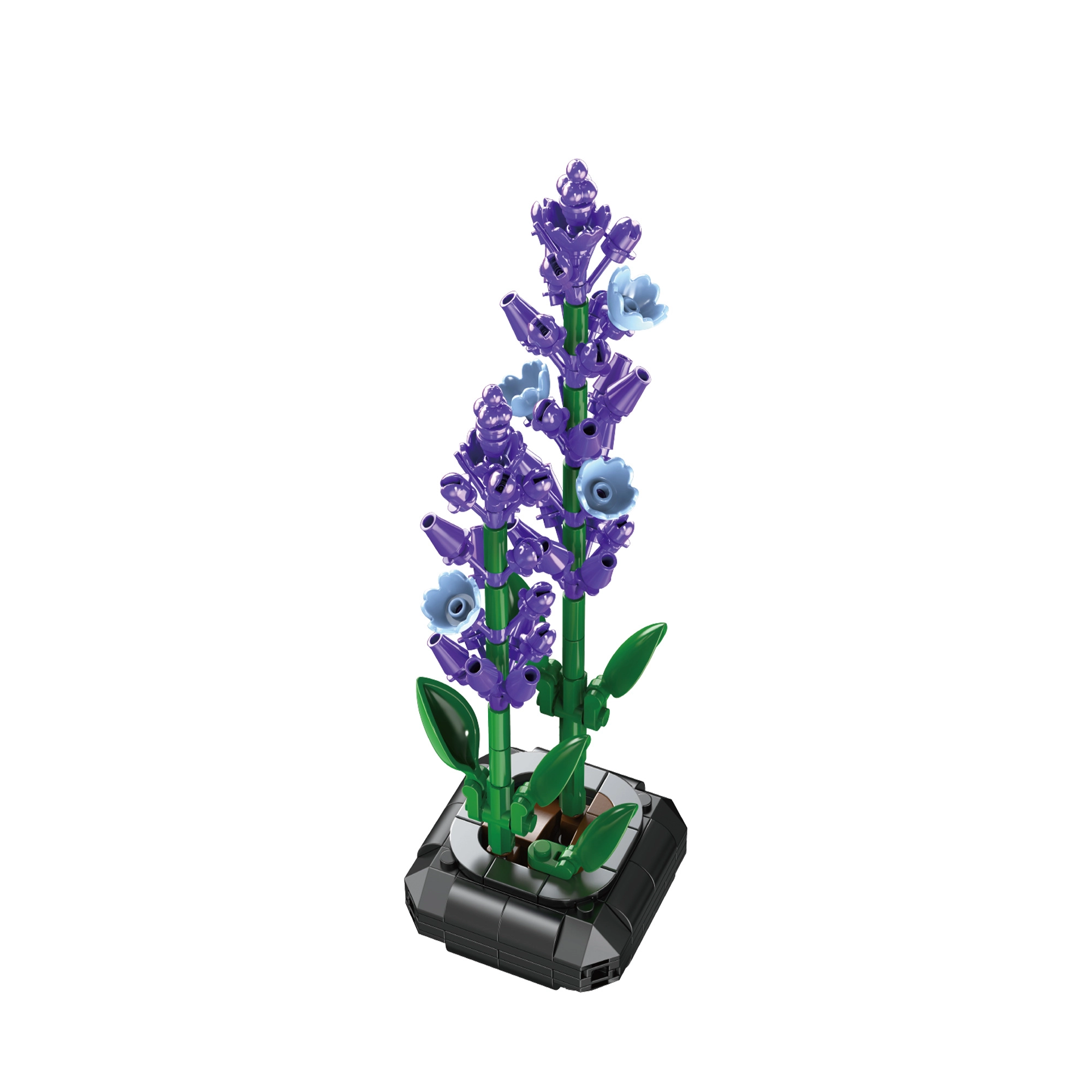 Részletgazdag virágok lila árnyalatokban és zöld szárak adnak természetes hangulatot a belső térnek, gondozási igény nélkül. A kész modell elegánsan mutat bármely helyiségben.