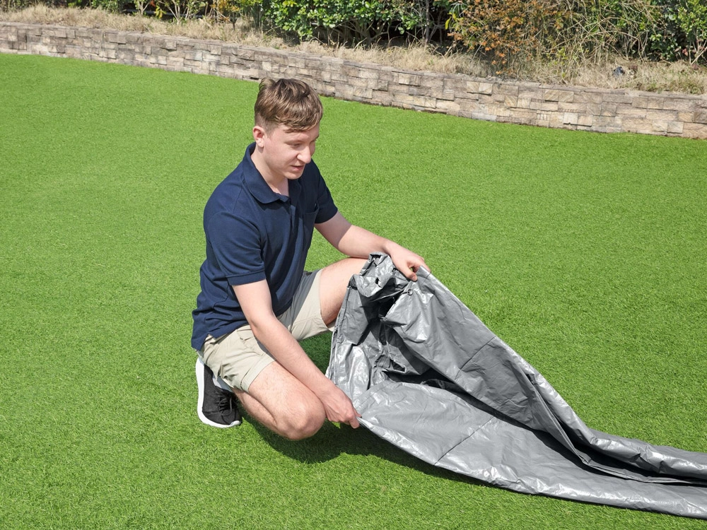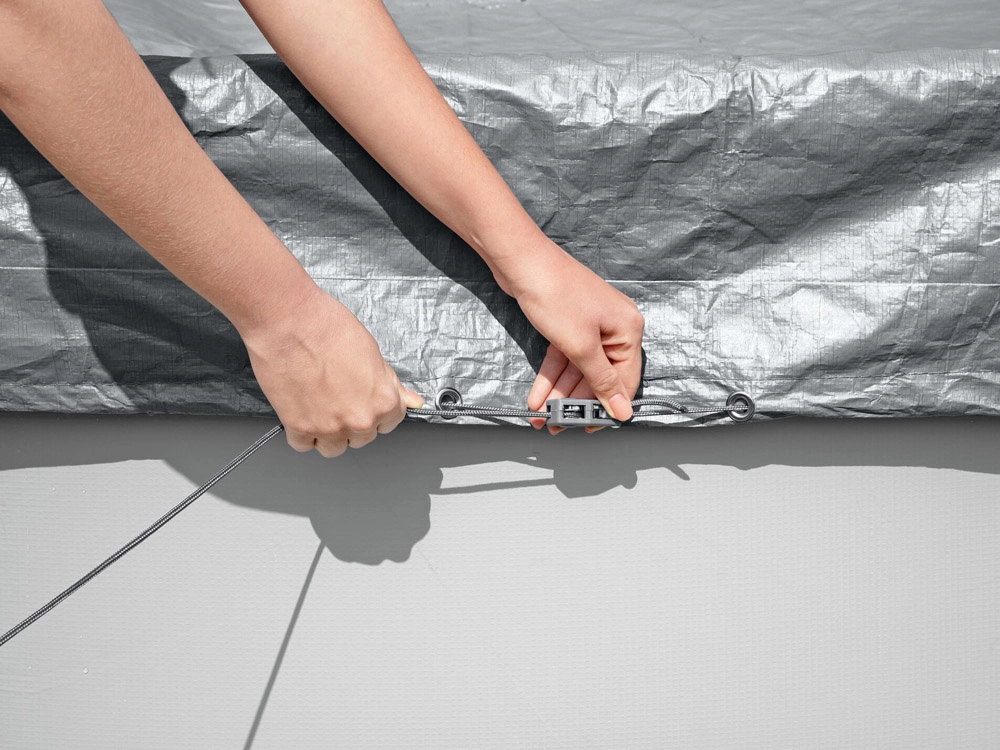Az okos vízelvezető nyílások áteresztik az esővizet, így nem alakulnak ki tócsák a takarón. A szélálló szorítós mechanizmus és a húzózsinór biztosítja a szoros illeszkedést a perem mentén, hogy a takaró rosszabb időjárási körülmények között is a helyén maradjon.