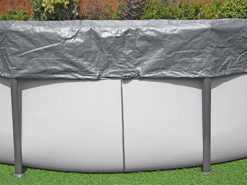 A szorítós mechanizmus és a húzózsinór stabilan a helyén tartja a takarót, és javítja a tapadást a medence teljes kerületén.
