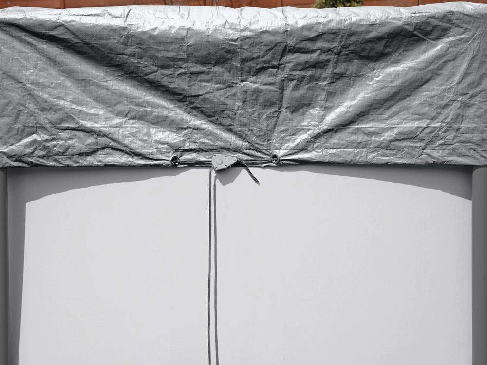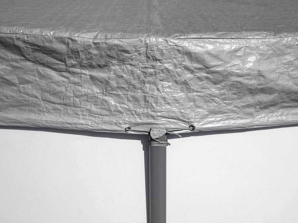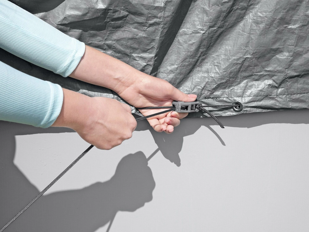 A szélálló rögzítőrendszer húzózsinórral és fűzőszemekkel rosszabb időjárási körülmények között is stabilan a medencén tartja a ponyvát.